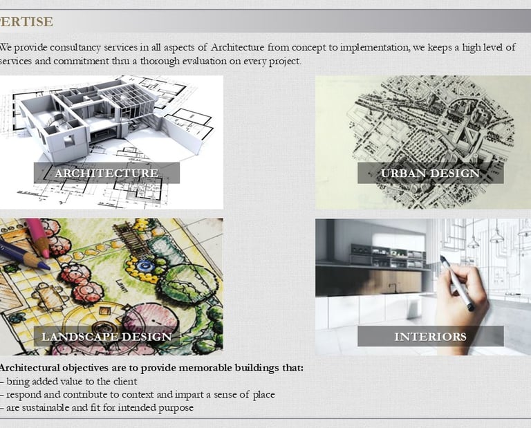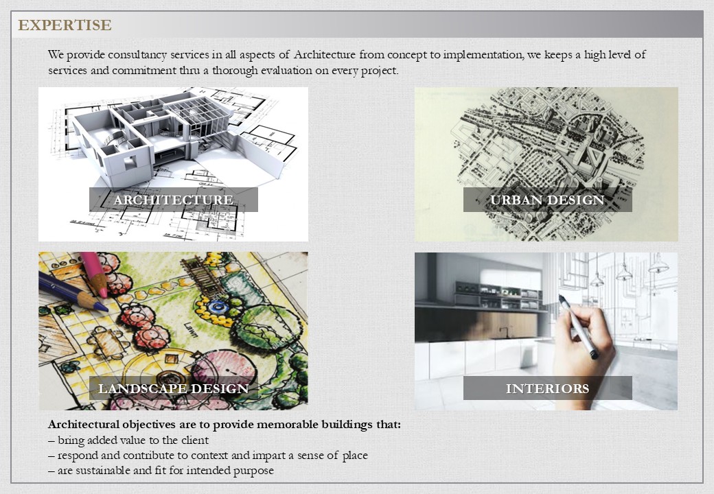 We provide consultancy services in all aspects of Architecture from concept to implementation, we keeps a high level of services and commitment thru a thorough evaluation on every project.